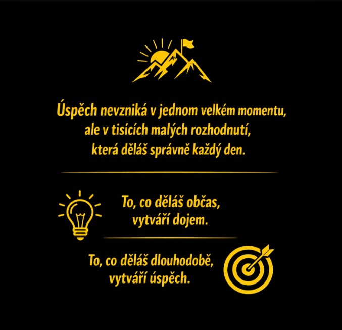 Tento vizuál připomíná, že skutečný úspěch nevzniká najednou. Rodí se v každodenních volbách, které možná na první pohled vypadají malé a nenápadné, ale právě ony formují naši budoucnost.
